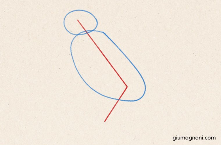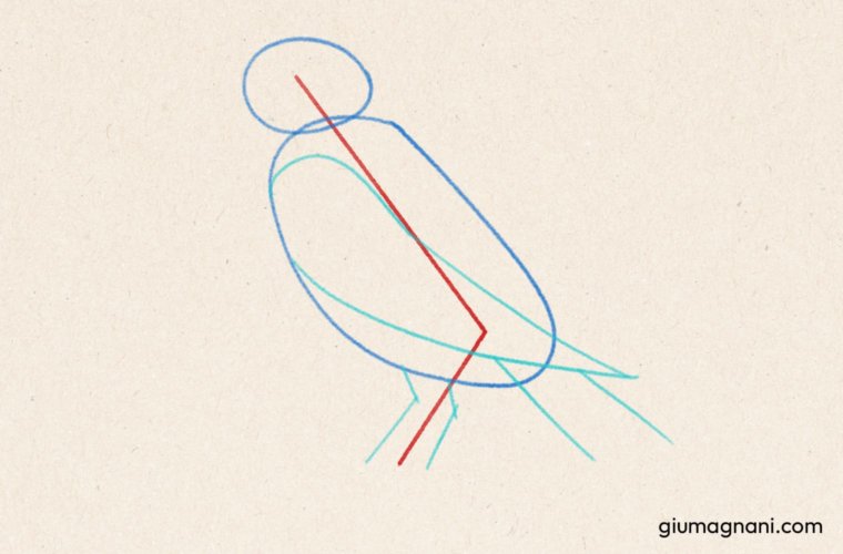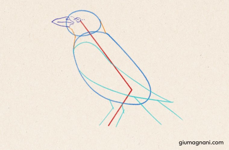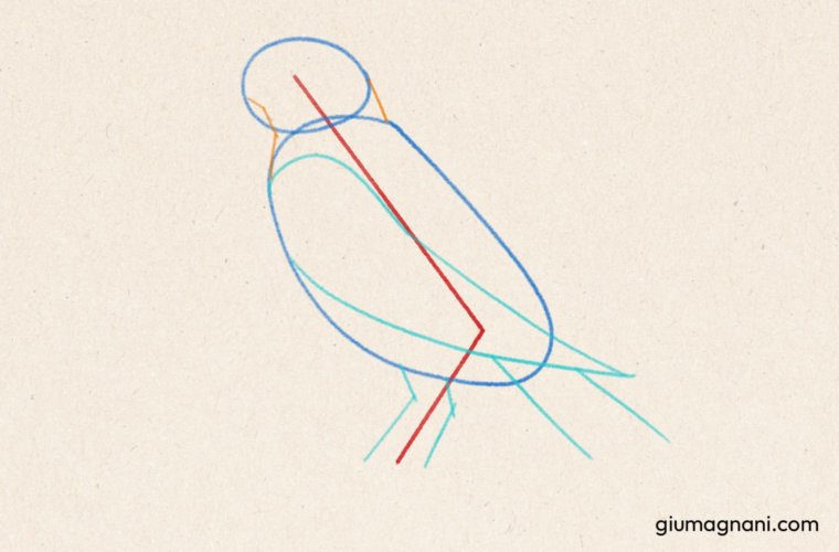 Paso 3: Trazas las formas de las alas, cola y pies del pájaro - Líneas de unión: Traza las líneas que unen la cabeza al cuerpo del pájaro, fíjate que tengan el mismo ángulo que las de la foto de referencia.