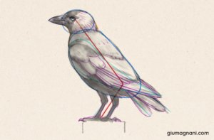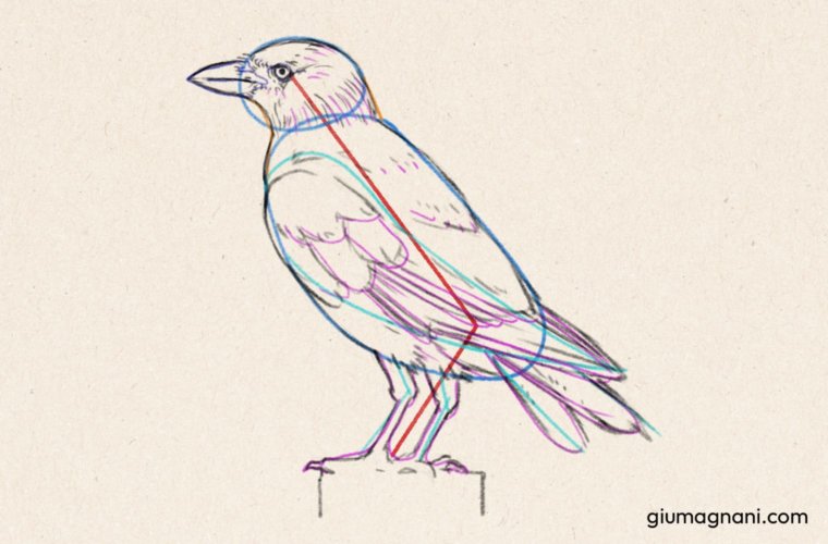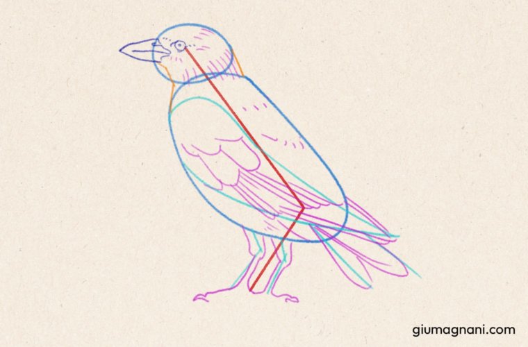Paso 2: Trazar las formas de la cabeza y cuerpo del pájaro - Formas secundarias: Luego dibujar las alas, cola y patas del pájaro. Nuevamente preocúpate de que se vea equilibrada y proporcionada a la referencia original.