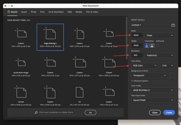 Cómo crear un lienzo en Photoshop listo para imprimir en alta resolución, 5000 x 5000px, 300 de resolución y modo de color RGB - Postura: Empieza trazando una línea para la postura del pájaro, yo las haré en distintos colores para que sea más claro.