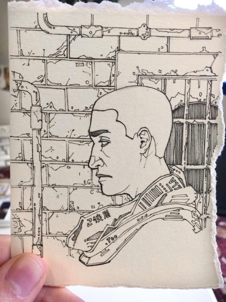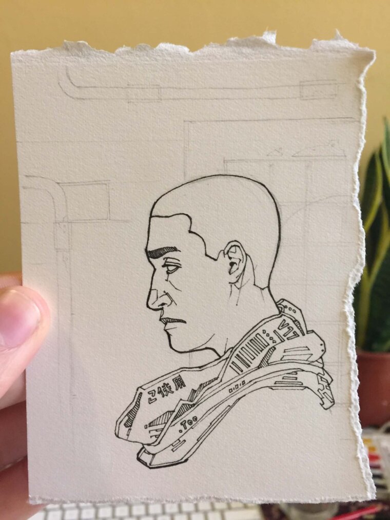 Dibujo a lápiz grafito finalizado del astronauta, listo para entintar y pintarComenzando a entintar al personaje de este dibujoEntintado finalizado para la ilustración del astronautaFondo del dibujo del astronauta ya terminado, pintado con acuarelas y marcadores CopicFotografía de la ilustración final del astronauta, pintado con acuarelas y marcadores Copic, delineado con tintaFotografía del astronauta con algunas de las herramientas que utilicé