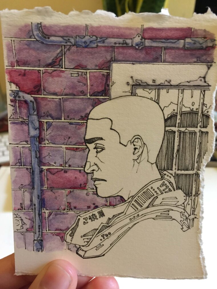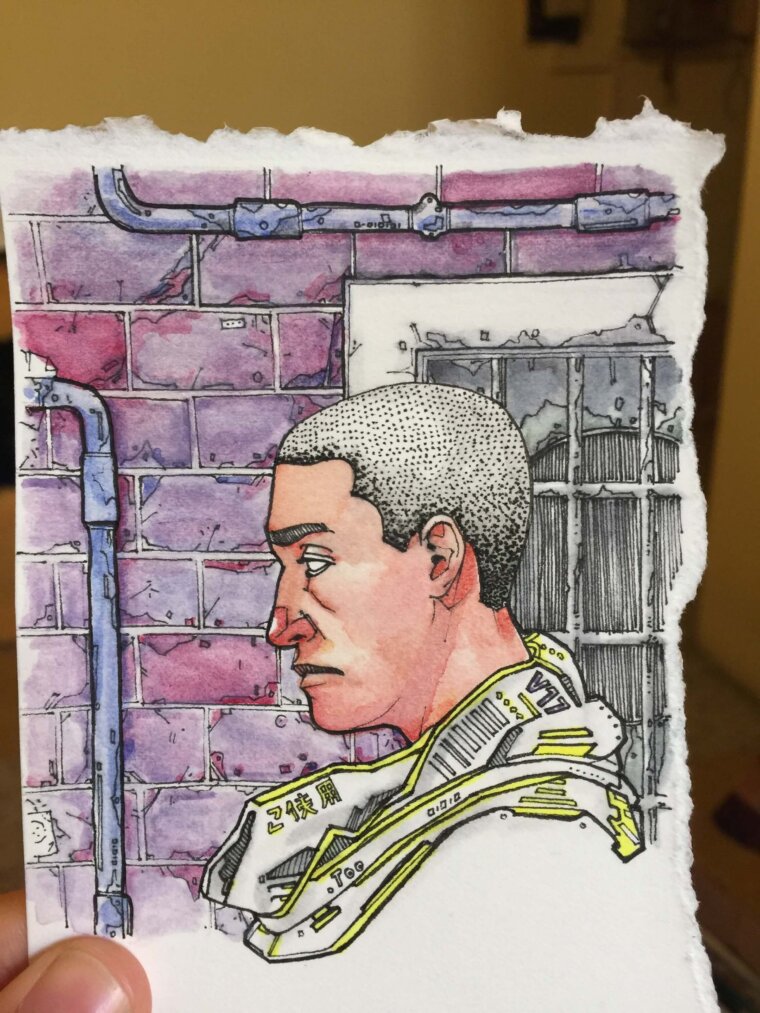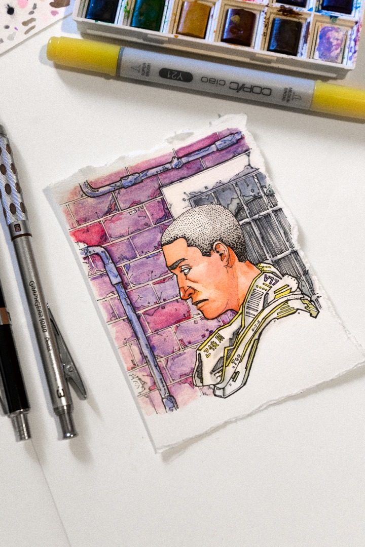 Ilustración de un astronauta, pintado con acuarelas y marcadores Copic, delineado con tinta.