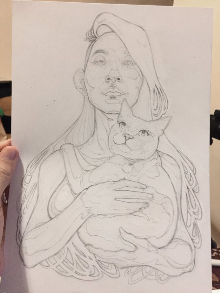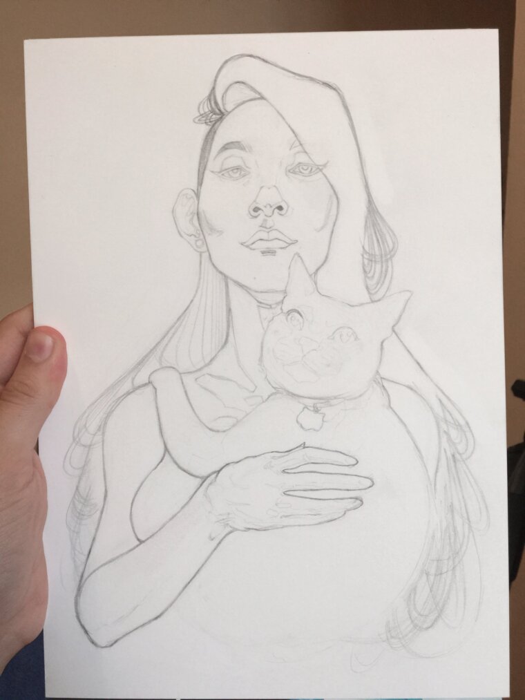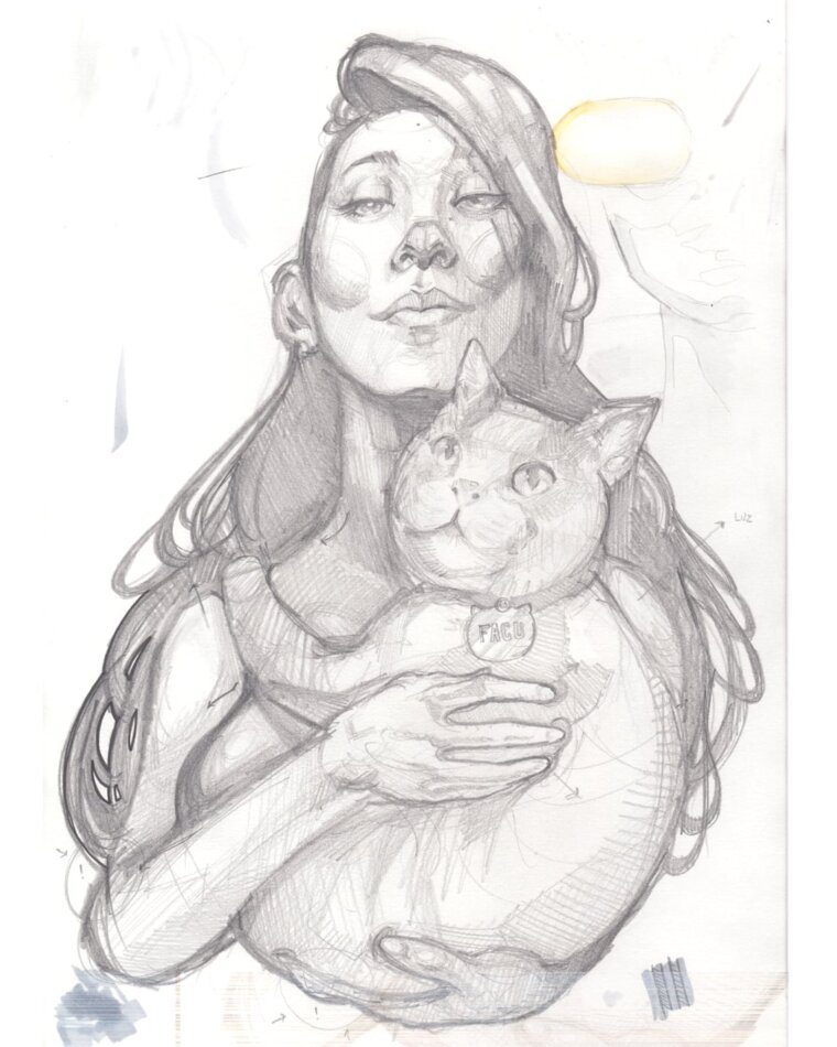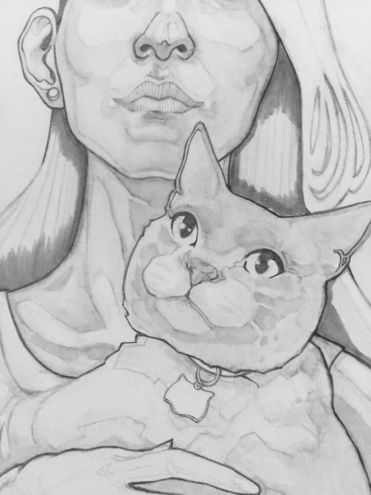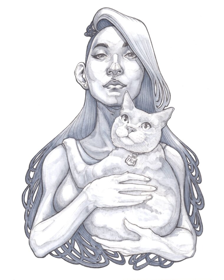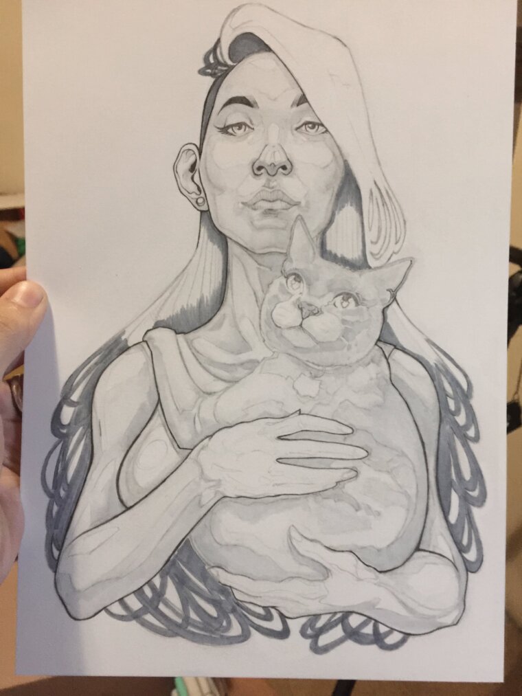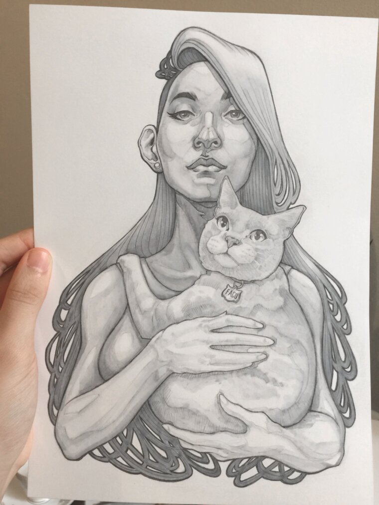 Acercamiento de dibujo finalizado de chica con gato, hecho con lápiz grafito y rotuladores Copic