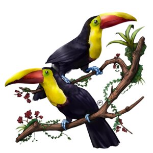 Pintura digital de dos tucanes de pecho amarillo. Estas aves, también conocidas como tucanes de garganta negra, se encuentran en Centroamérica y el norte de Sudamérica.